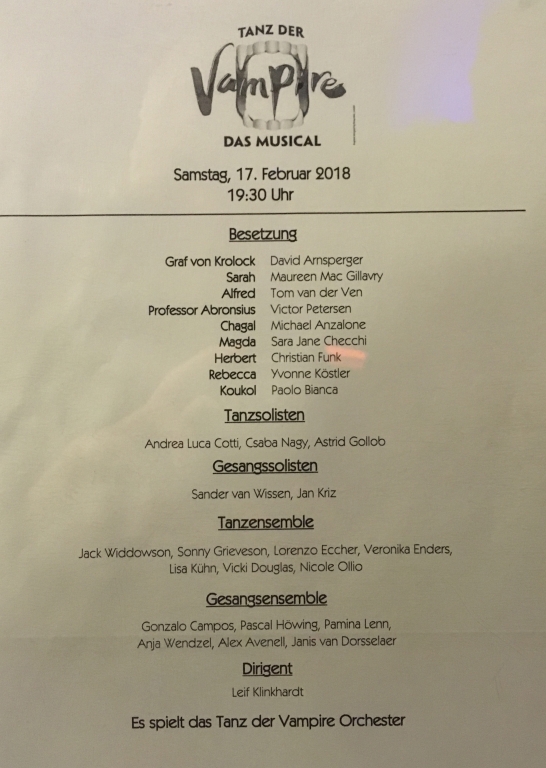 Nach drei Previews war es am Samstag, 17.02.2018, soweit: Die Premiere von “Tanz der Vampire” in Köln stand auf dem Programm. Mit einem nagelneuen Grafen (David Arnsperger) und generell vielen neuen Mitgliedern des Casts wurde das Projekt in Angriff genommen. Um es vorwegzunehmen: David Arnsperger bot eine hervorragende Leistung. Ich persönlich habe auf “Die unstillbare Gier” gewartet, das Solostück des Hauptdarstellers, um seine bis dahin bereits gute Leistung abschließend beurteilen zu können. Was soll ich sagen? Sehr, sehr gut! Er erreicht zwar nicht ganz die Qualität von Jan Ammann, aber kommt schon in seine Nähe – näher jedenfalls als Drew Sarich, der einen starken “Rocky” abgegeben hat und den Grafen derzeitig in Wien spielt.