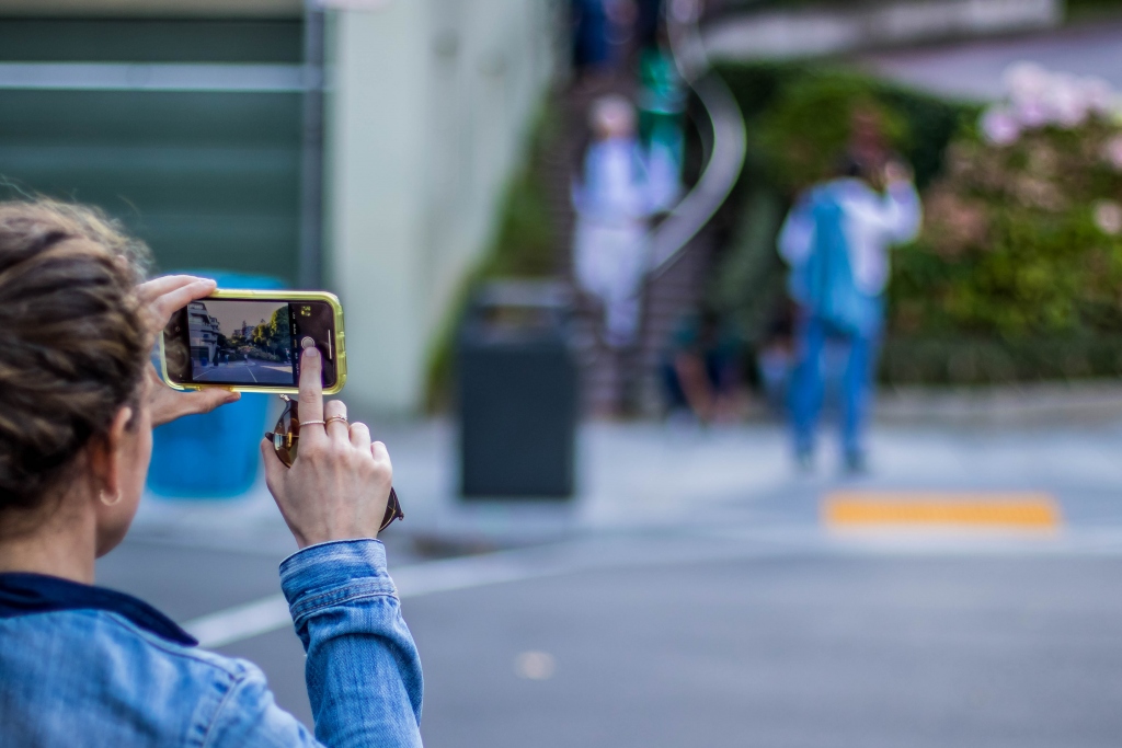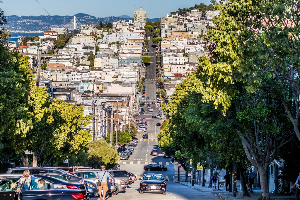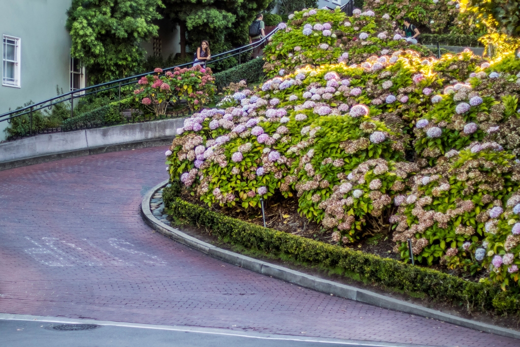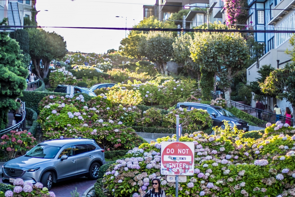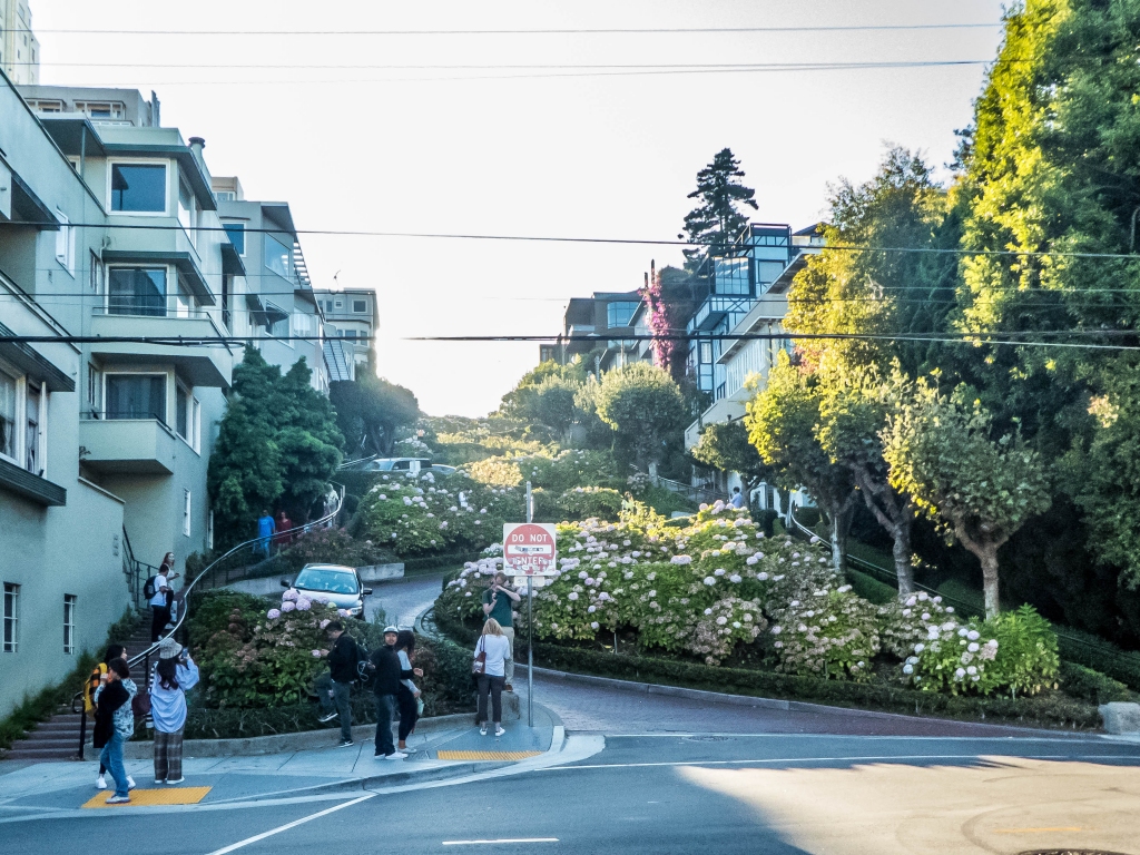 Steil ist sie, die Lombard Street. Und nein: Wir sind sie nicht mit dem Auto entlanggefahren, wie das Massen von Touristen tun. Dennoch guckten wir uns das Spektakel rund um die kurvenreichste Straße der Welt an. Ich hatte das Gefühl, alle Beifahrer in den Autos, die die Straße befuhren, machten ein Video von der Fahrt. Das wiederum lässt die Vermutung zu, dass niemand die Straße entlangfährt, weil er sie entlangfahren muss. Auf der gegenüberliegenden Straßenseite war alles voll von Touristen, die es teilweise auch gar nicht interessierte, wenn jemand dort abbiegen wollte; Selfies und Fotos vor der Lombard Street sind ja wichtiger!