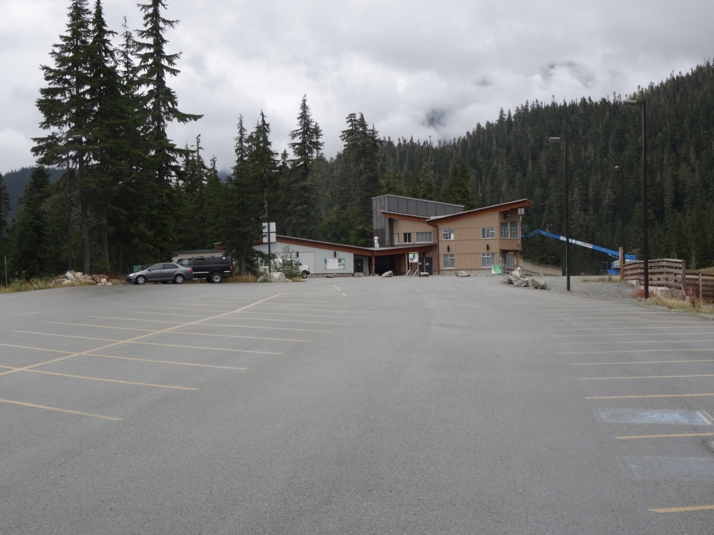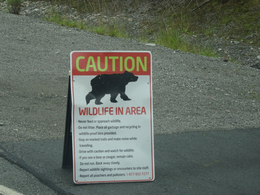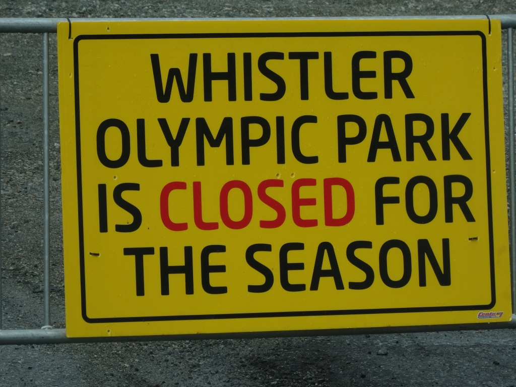Kurz vor dem Ortsende von Whistler war der Olympic Park ausgeschildert, der ja angeblich für die Öffentlichkeit geschlossen sein sollte, wie wir von anderen Campern auf der Reise erfahren hatten. Ich wollte aber trotzdem mal einen Blick riskieren, weil ich mir nicht vorstellen konnte, dass man rein gar nichts sehen konnte. Meine Frau gab ihr Okay und wir bogen nach rechts ab. 9 km sollten es noch sein. Wir fuhren durch die Einsamkeit, lediglich ab und zu kam uns ein Auto entgegen. Nach kurzer Wegstrecke stand tatsächlich an einem Absperrgitter der Hinweis, dass der Olympic Park ab Anfang September geschlossen war. Trotzdem dachte ich mir, dass man bestimmt was sehen kann und wir fuhren weiter. Als wir an der Einfahrt zum Olympic Park ankamen, stand noch einmal der gleiche Hinweis, aber die Durchfahrt war nicht verboten. Nach einer scharfen Rechtskurve standen wir vor zwei Holzhäuschen, die wie Kassenhäuschen aussahen. Hier war der Hinweis “No Public Access” zu lesen. Hielt uns das auf? Nein!