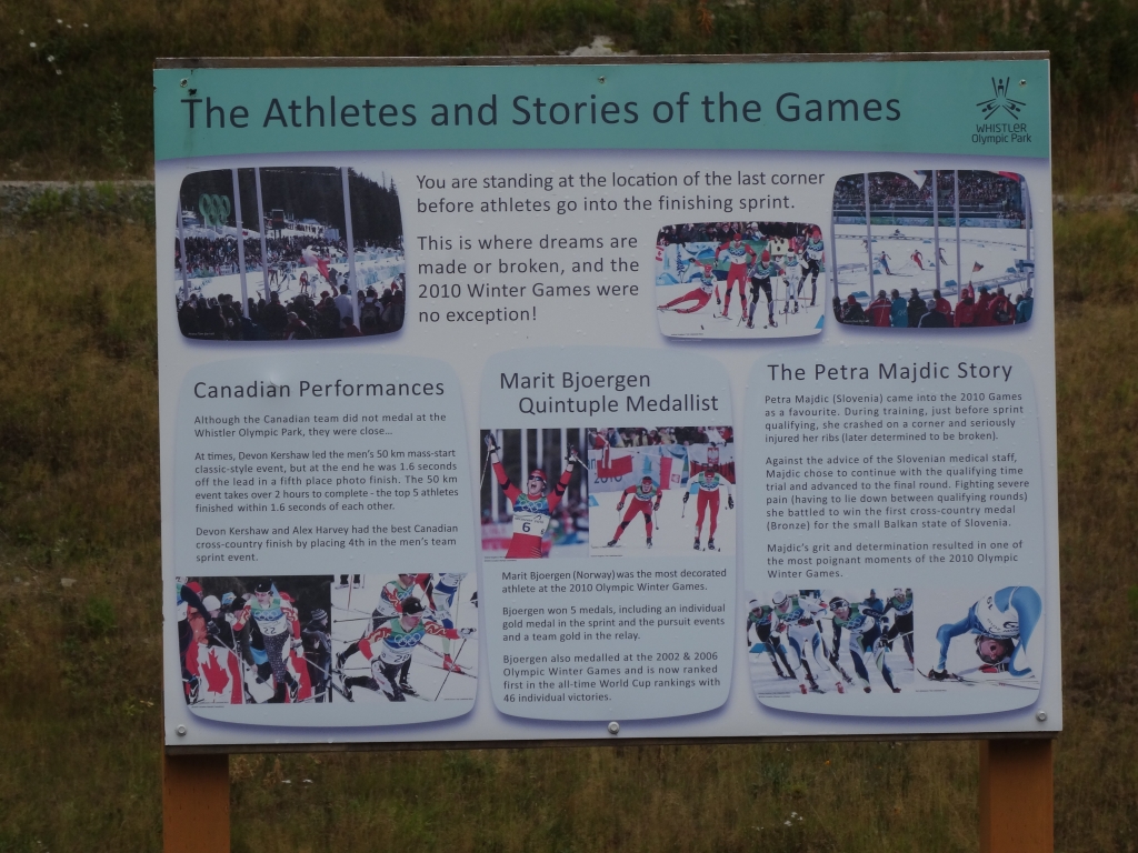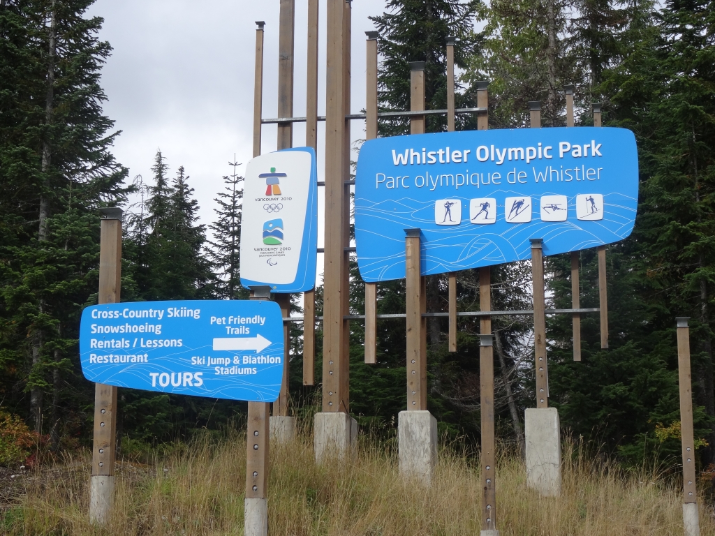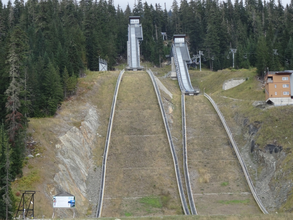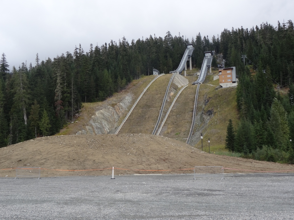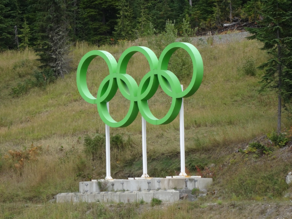 Wir fuhren weiter auf der kurvigen Straße und konnten schon kurze Zeit später zwischen den Bäumen die Skisprungschanzen sehen. Weiter! Wir fuhren an den Schanzen vorbei und machten ein paar Fotos. Ganz hinten sah man die Olympischen Ringe. Weiter! Als wir dort ankamen und unsere Fotos im Sack hatten, fuhren wir zur Biathlonanlage. Ein älteres Ehepaar war mit ihrem Pkw ebenfalls hier unterwegs wir entdeckten die Frau, wie sie neben einem Haus auf einer Anhöhe stand und ihrem Mann zuwinkte, dass er zu ihr kommen sollte. Das war uns dann doch ein Stück zu verboten und wir drehten wieder. Als wir wieder an den Skisprungschanzen ankamen, fuhr ich so nah wie möglich an die Auslaufzone und stieg aus. Überall standen im Olympic Park Warnschilder vor Bären, aber ich hatte eher ein mulmiges Gefühl, weil wir vielleicht gar nicht hier sein durften. Ich kletterte einen kleinen Hügel hoch und stand direkt in der Auslaufzone der Schanzen. Yes!!! Die Anzeigentafel links der Großschanze war nicht mehr vorhanden und alles sah so aus, als ob es verfallen würde. Als ich mich umdrehte, sah ich das auf einem Schotterplatz abgestellte Wohnmobil. Irgendwie konnte ich mir nicht vorstellen, dass hierhin im Jahr 2010 die Augen der (Sport-)Welt gerichtet waren. Hier war jetzt tote Hose und es sah alles überhaupt nicht glamourös aus. Mit einem teils schönen Gefühl, das alles jetzt von nahem gesehen zu haben, und einem teils etwas komischen Gefühl stieg ich wieder ins Wohnmobil und wir fuhren die 9 km zurück zum Highway 99. Während dieser Fahrt ärgerte ich mich dann doch ein wenig, dass ich an der Biathlonanlage nicht ausgestiegen und es der Frau gleich getan hatte. Aber das war jetzt nicht mehr zu ändern.