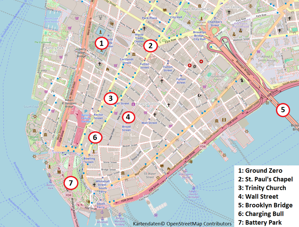 Da viele Punkte teilweise nah zusammen liegen, beschränke ich mich hier auf die meiner Meinung nach sinnvollsten Varianten, denn man wird seine Sightseeing-Tour wohl kaum an der Trinity Church beenden, sondern dann noch die Wall Street mitnehmen (oder umgekehrt). Trotzdem findet man natürlich in der Nähe eines jeden Spots eine Haltestelle der Subway.