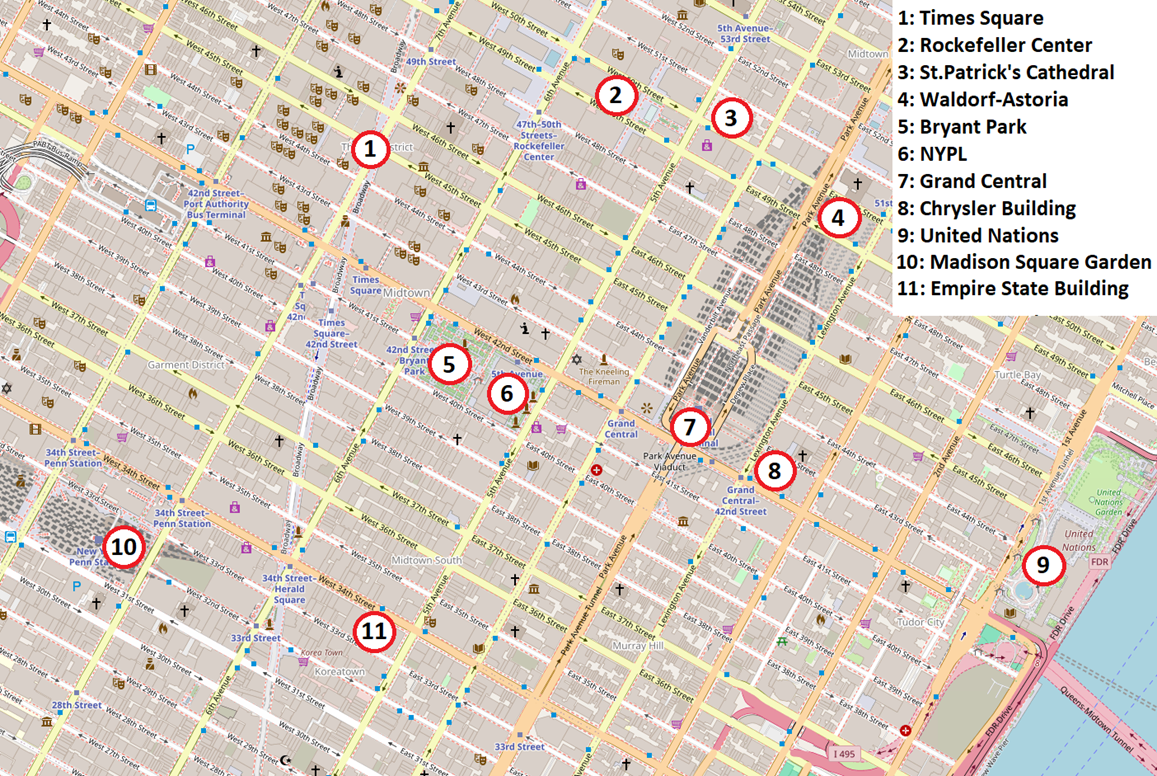 Bis zum Empire State Building läuft man von hier aus ca. 15 Minuten in Richtung Süden, bis zum Times Square ca. zehn Minuten in westliche Richtung.